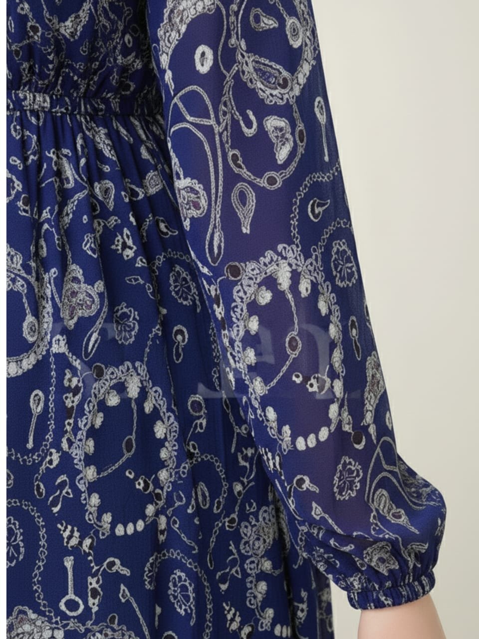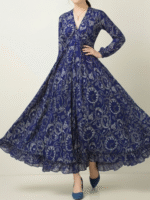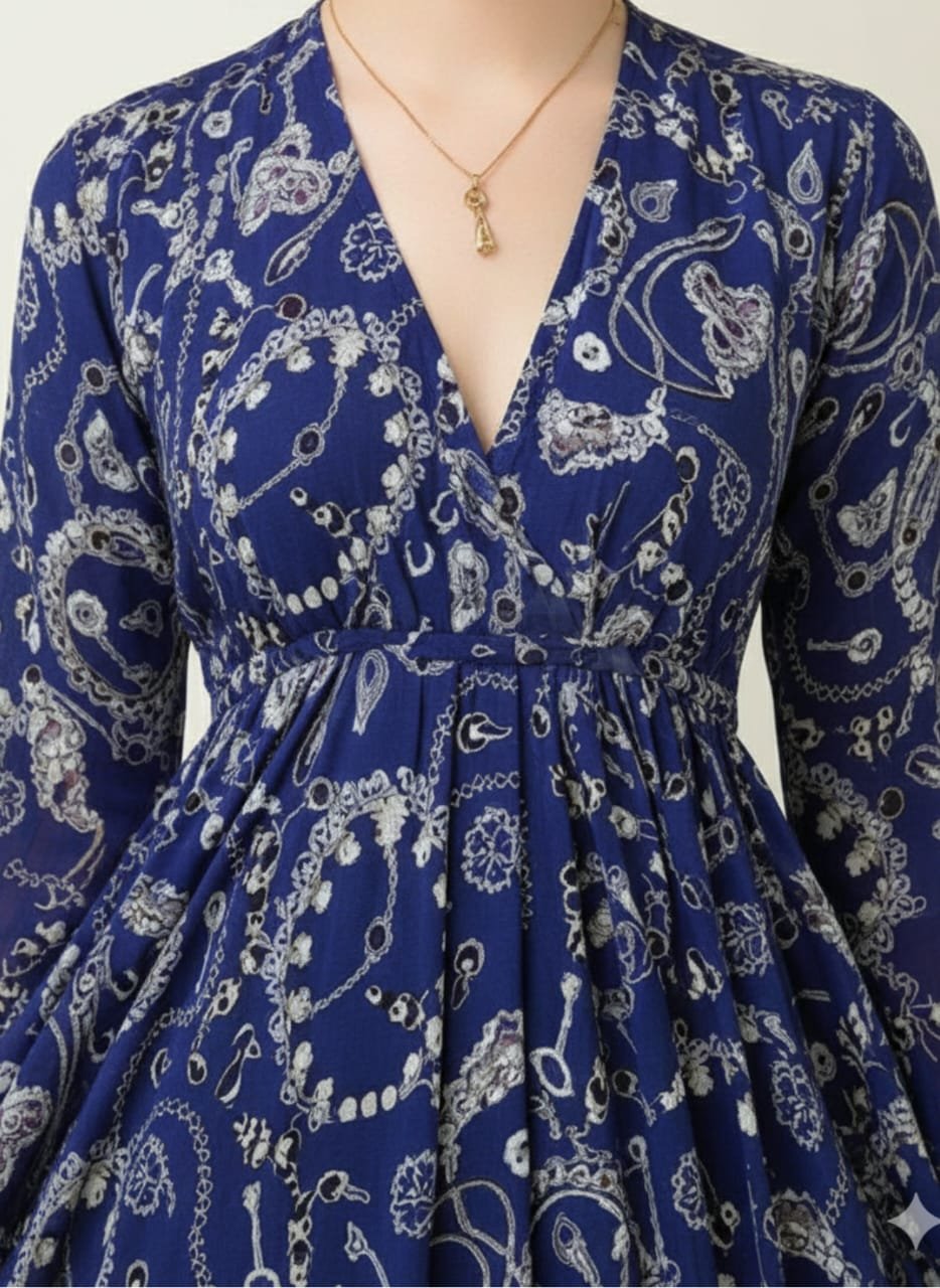 This dress made with premium chiffon polyester. Elegant royal blue chiffon maxi dress with paisley print, V-neckline, long sleeves, and flared hem with chiffon ruffles.